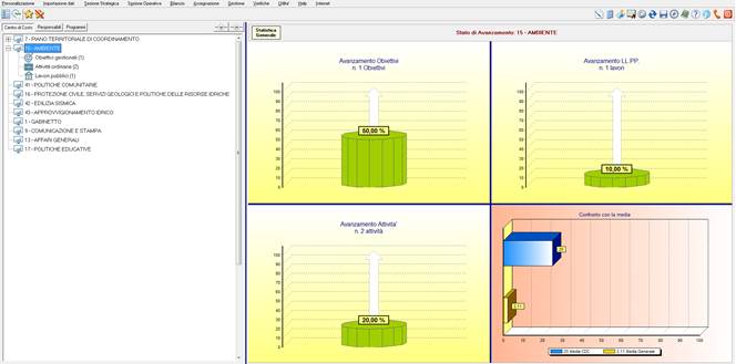 Quando è selezionato un gruppo è disponibile in formato grafico la statistica relativa l’avanzamento medio degli elementi connessi al gruppo. È presente anche il grafico a barre orizzontali che evidenzia l’avanzamento del gruppo rispetto gli altri gruppi dello stesso tipo. Come mostrato nell’immagine seguente vediamo che l’obiettivo ha avanzamento 50%, che il Lavoro pubblico ha avanzamento 10% e che le due attività ordinarie hanno avanzamento medio del 20%. L’intero centro di costo è al 25% su una media di tutti i centri di costo del 2,11%.