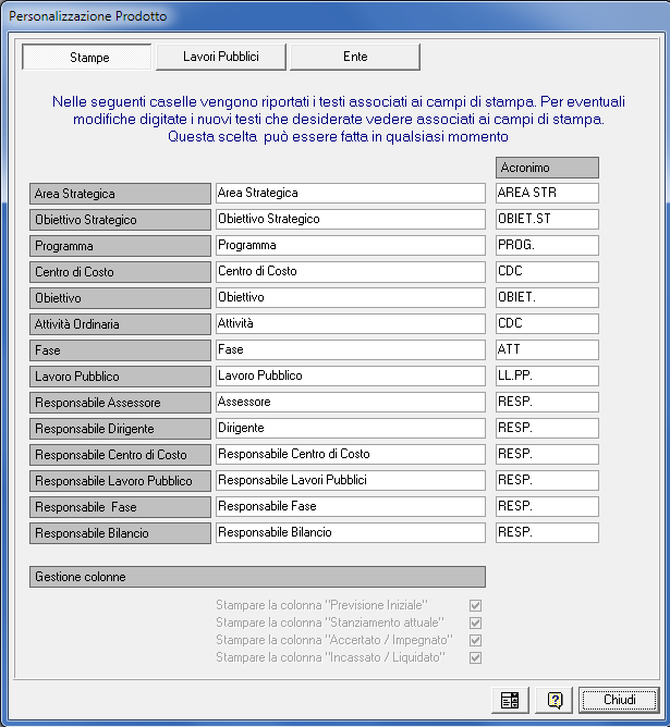 Stampe: Consente di scegliere i testi associati ai campi delle mappe e in stampa per le terminologie dei vari oggetti in uso nel programma. Ad esempio è possibile titolare i “Centri di Costo” come “Centri di Responsabilità” o con qualsiasi altra definizione a vostra scelta. Ecco la lista dei termini personalizzabili. Il campo “Acronimo” di riferisce alla terminologia breve in uso ove non ci sia lo spazio per la descrizione lunga, ad esempio nelle testate di colonne.