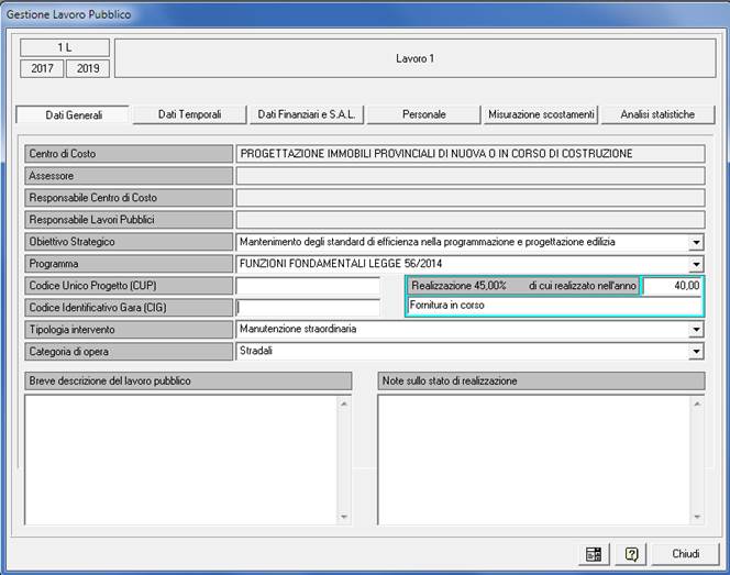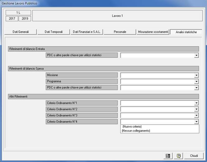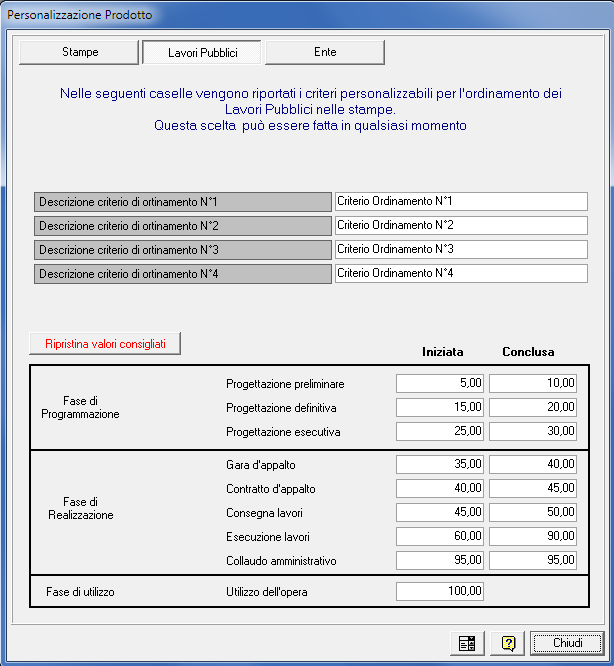 Lavori Pubblici: Consente di dare titoli personali ai quattro criteri di ordinamento per le analisi statistiche. La zona relativa alle fasi di avanzamento lavori consente di decidere il peso in percentuale di ogni singola fase nei confronti della realizzazione totale dell’opera al fine di personalizzare il grado di avanzamento lavori che il programma calcola in automatico.