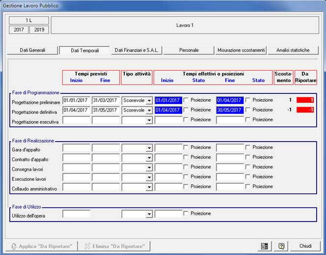 Sezione ‘Dati Temporali’: vengono riportate le nove fasi di attività. Per ognuna di esse possono essere definiti i tempi di attuazione e il tipo di attività. Il sistema controlla gli scostamenti da riportare.
