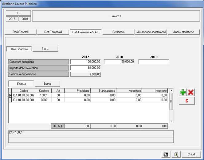 Sezione ‘Dati Finanziari e S.A.L.’: nei dati finanziari è possibile collegare i capitoli di entrata e di spesa associabili all’opera. Tramite il bottone “€” vanno inseriti gli importi destinati e controlla rispetto agli importi disponibili.