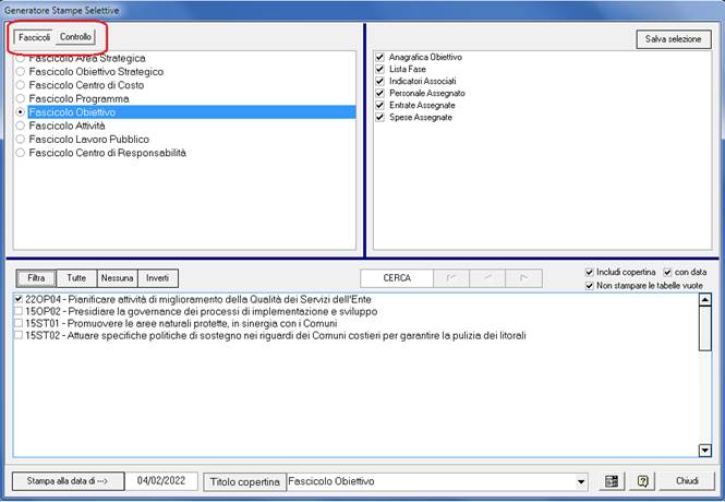 Il primo riquadro in alto a sinistra permette di selezionare il Fascicolo o la stampa di Controllo con cui lavorare.